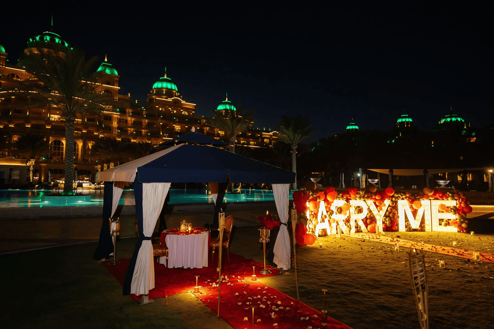 Dubai’s marina is known for its glamour, and a yacht proposal takes that to the next level. Charter a private yacht, sail along the coastline, and pop the question against the backdrop of the Burj Al Arab or Atlantis, The Palm. Add in a private chef, champagne, and roses, and you’ve created a luxury experience worthy of your love. For extra sparkle, consider adding the best event lighting rental Dubai to illuminate your yacht proposal with a romantic glow.