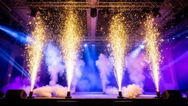 Safe indoor spark fountain effects using cold titanium-based compound instead of fire. Sparks are cold to touch and perfect for weddings, awards, and stage reveals.